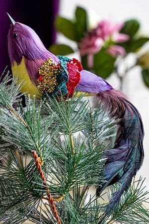 Будто выполненные в технике текстильной мозаики, когда из разных лоскутков ткани создаётся полотно с новым цветовым и фактурным решением - эти птички так ярки, свежи и необычны, что точно оживят любую новогоднюю композицию, будь то декор комнаты или новогоднего деревца. Тут и зелень листьев, и насыщенные краски цветов. И, конечно, прекрасные белые крылышки и хвостик из перьев, создающие ощущение такой натуральности, что кажется чуть вспугни красоток — и они взлетят!