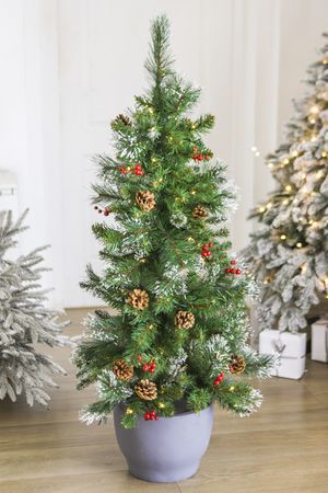 Характеристики: Высота: 120 см. Диаметр нижнего яруса: 55 см. Общее количество веток: 158 шт. Тип хвои: леска + ПВХ. Цвет хвои: зеленый, заснеженный. Подсветка: 80 теплых белых ламп. Контроллер, обеспечивающий 8 режимов, в т.ч. режим постоянного свечения. Работает в режиме Таймер на 6 часов. В режиме таймер подсветка автоматически выключается после 6 часов работы. На следующий день она автоматически включится в то же время, когда была включена в первый раз. Работает от батареек: 3 шт, тип АА (в комплект не входят). Декор: искусственные ягоды, натуральные шишки. Тип крепления веток: отгибающиеся. Подставка: кашпо. Примерный срок работы от одного комплекта батареек: 30 часов (зависит от качества батареек). Степень влагозащиты: IP44 (подходит для использования в помещении и на улице в местах, защищенных от прямого воздействия струй воды, например, под козырьками и навесами)