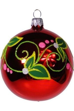 Стеклянный елочный шар с ручной росписью. Диаметр шара - 75 мм Цвет - красный Материал: стекло.