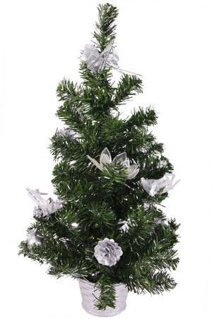 Новогодняя искусственная елка украшена серебряными натуральными шишками, бантами, декоративными цветами и шариками. Елочка установлена в декоративной пластиковой корзине.