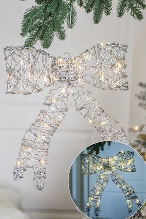 Огромный бант светится и мерцает великолепием серебра, создавая восхитительную атмосферу новогоднего волшебства и утонченной роскоши! Подойдет и для новогодней елки, и для рождественского венка, и для гирлянды. Гармонично впишется в любое дизайнерское решение – захотите ли вы украсить праздничный стол, шторы или иные детали интерьера.