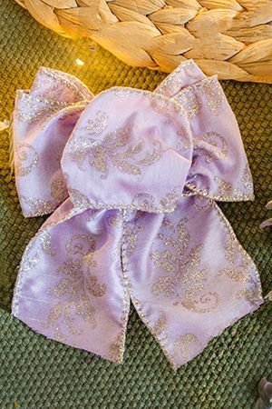 Бант в качестве праздничного украшения ёлочки - отличное решение, ведь он никогда не разобьётся, не сломается и займёт минимум места при хранении. Но главное, бант - это красиво и изысканно! Бант из органзы нежнейшего лилового оттенка с чудесным декором, напоминающим золотистый звездопад, при желании может заменить ёлочную верхушку, а если разместить несколько таких бантов между другими украшениями, то ваша ёлочка будет выглядеть настоящей кокеткой!