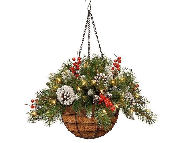 Эффектная,изумительно красивая композиция из искусственной хвои, украшенная натуральными заснеженными шишками и ягодками, в подвесном кашпо с лампочками.