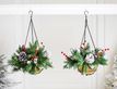 Эффектная, изумительно красивая композиция из искусственной хвои, украшенная натуральными заснеженными шишками и ягодками, в подвесном кашпо с лампочками.