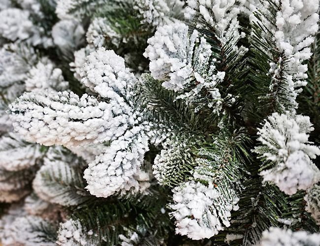 Особенность этой ели - сочетание литых пластиковых веточек с классической хвоей из PVC. Литые иголки визуально не отличимы от настоящих, что придает ели необычайное сходство с натуральным деревом. Декор ели - напыление искусственного снега (флокирование). Искусственный снег - флок - хорошо держится на хвое, не осыпается. Подобное оформление ели в последние годы стало очень популярным в европейских странах.