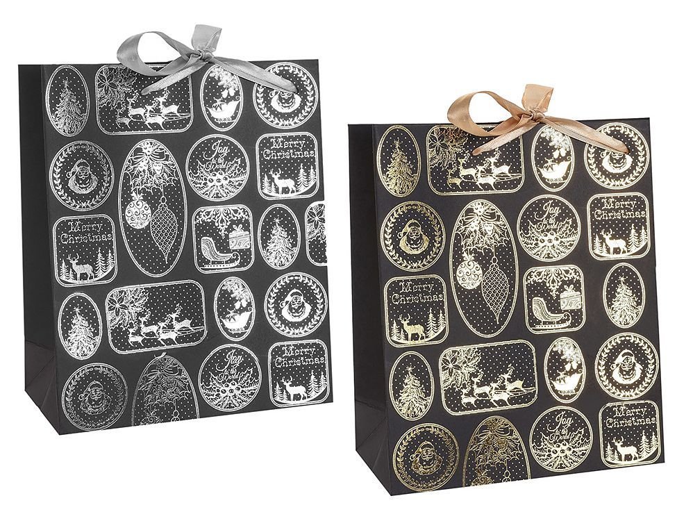 Замечательно элегантный пакет с рождественскими мотивами и атласными ручками для самого стильного подарка!