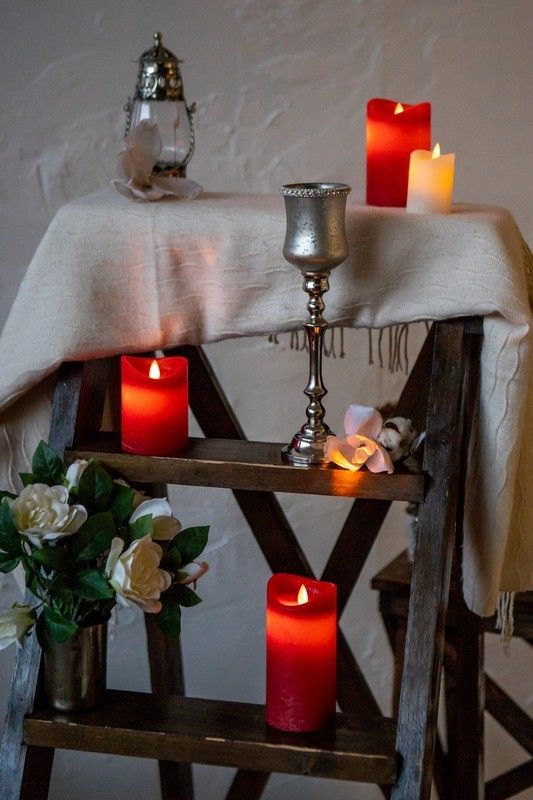Светодиодная восковая свеча ПРАЗДНИЧНАЯ, с глиттером, красная, тёплый белый LED-огонь колышущийся, 7.5x10 см, батарейки, таймер, Kaemingk