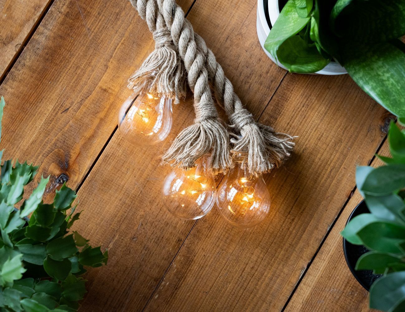 Три стилизованные лампы накаливания на распушённых забавными кисточками концах джутовых верёвочек (канатов) смотрятся весьма привлекательно и уютно!