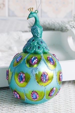 Экзотический красавчик Павлин гордо встречает свет праздничных огней, переливаясь нежными бликами. Особенно хорош его великолепный хвост, словно сшитый из фантастических ледяных лепестков!