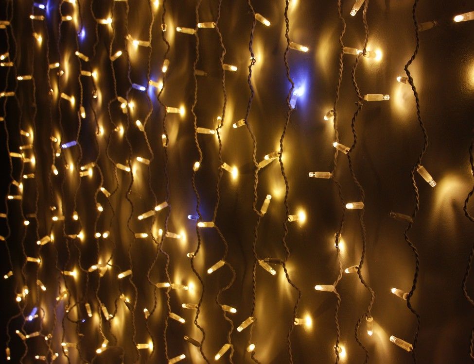 Светодиодный занавес облегченный, мерцающий - это гирлянда состоящий из основного провода с свисающими с него нитями со светодиодами в влагозащитных колпачках, с постоянным горением основного цвета и мигающими светодиодами холодно белого свечения.