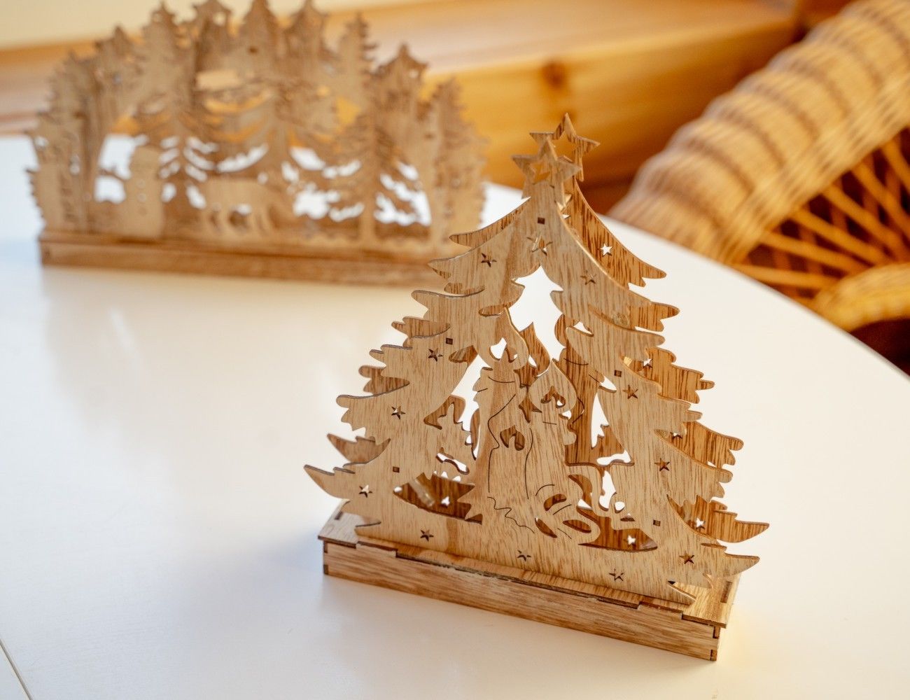 Симпатичная и невероятно уютная деревянная ёлочка с резным новогодним рисунком внутри готова светить для вас тёплым светом хоть каждый вечер, вызывая улыбку, приятные воспоминания и радужные мечты!