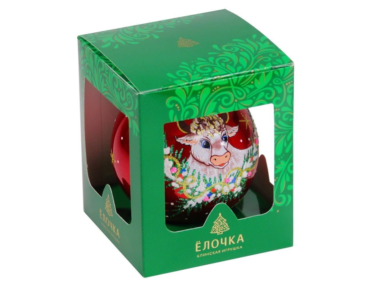 Елочный шар ЗОДИАК: НОВОГОДНЯЯ КОРОВА, красный, 85 мм, Елочка