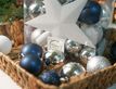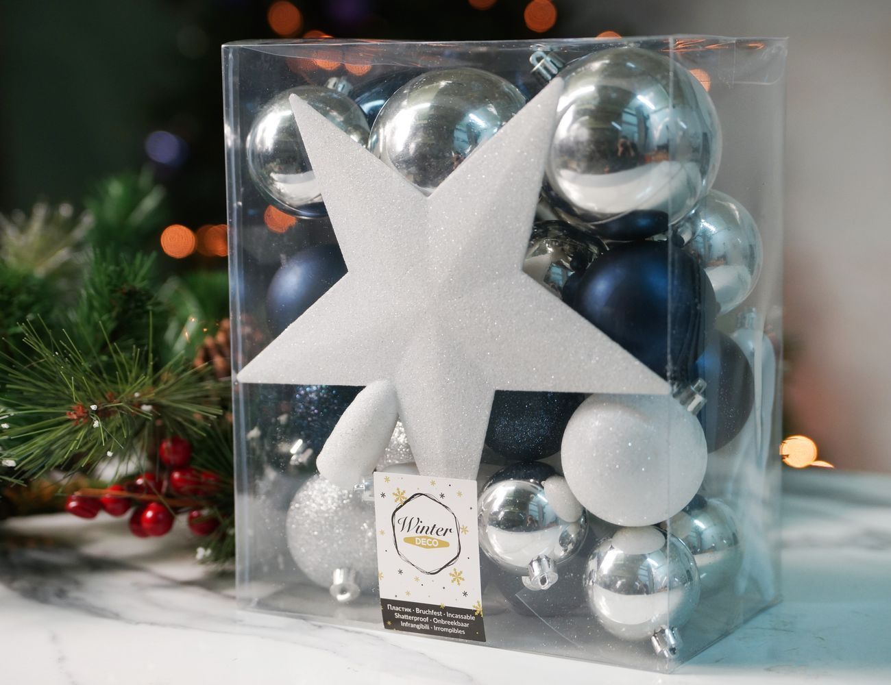 Набор пластиковых елочных шаров и украшений НОВОГОДНИЙ, цвета: серебряный, белый, синий бархат, упаковка 33 шт., Winter Deco