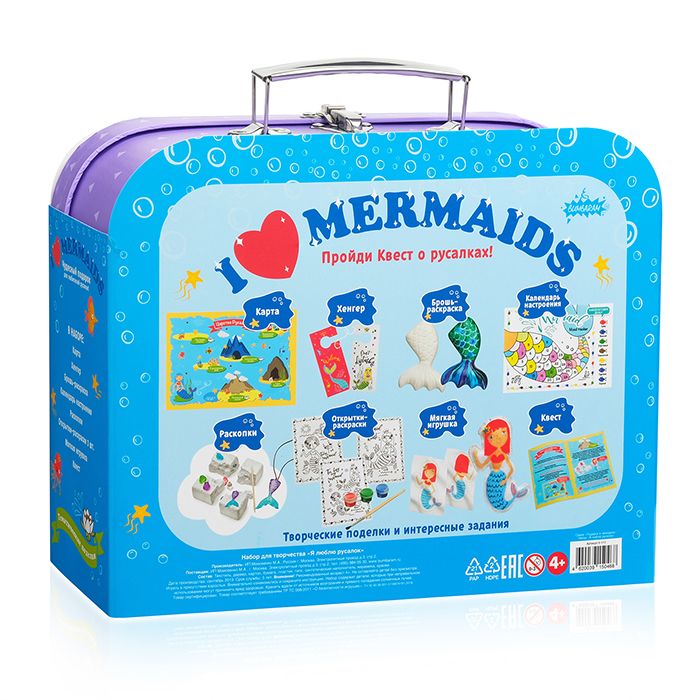 Большой увлекательный набор надолго займет вашего ребенка, ведь в нем содержатся развлечения на любой вкус. Можно пройти квест и помочь русалкам, найти настоящий клад, сделать красивое украшение, оформить праздничные открытки и сшить мягкую игрушку.