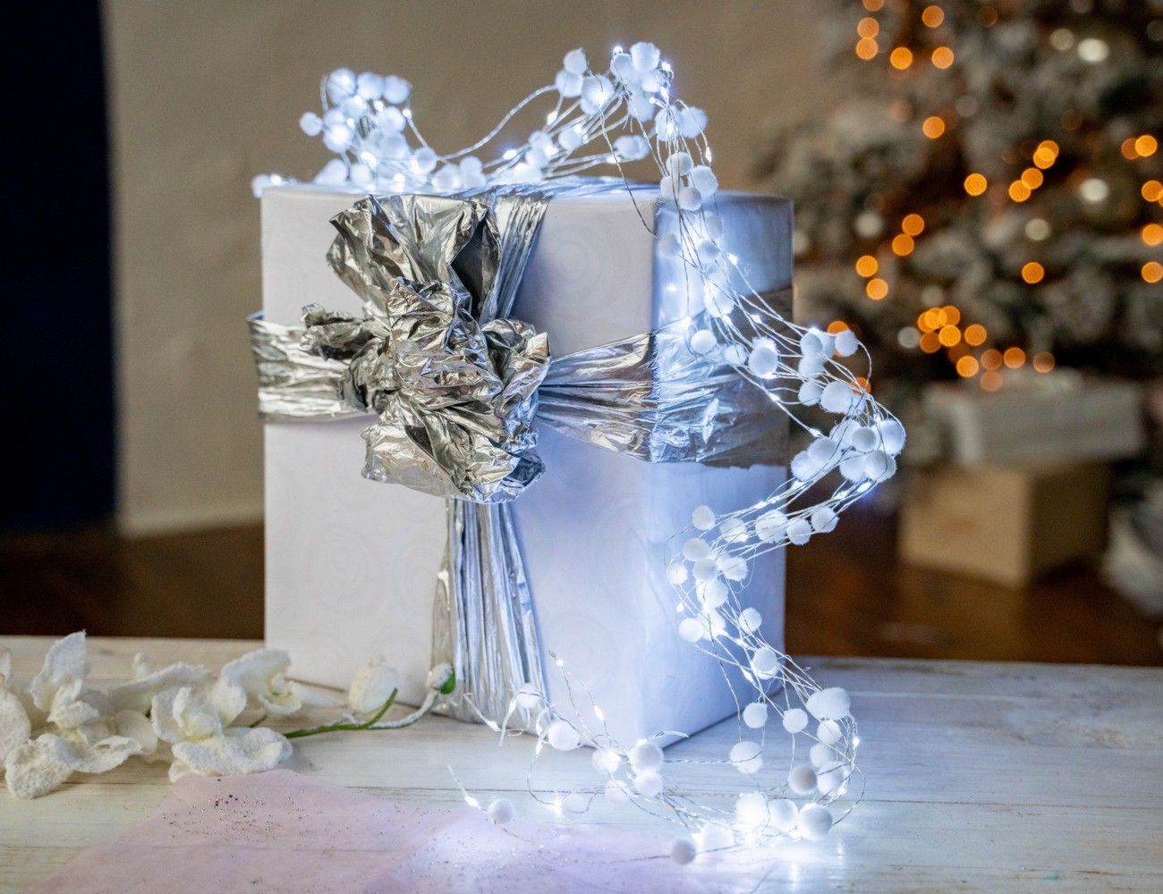 Серебристые нити, унизанные снежными шариками, ещё и светящимися тёплым уютным светом - волшебный снегопад станет обаятельно сказочной зимней ноткой в праздничном декоре! А уж как здорово он будет смотреться на ёлке!