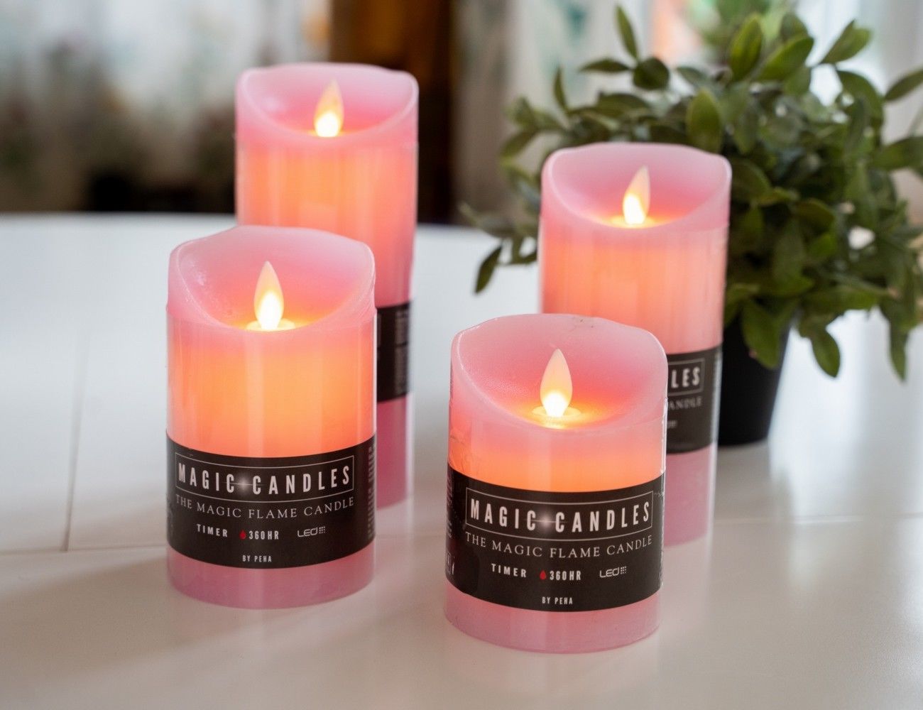 Свеча восковая МЕРЦАЮЩАЯ, розовая, тёплый белый LED-огонь колышущийся, 7.5х15 см, Peha Magic