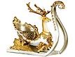 Сани-сказка, сани-мечта! Истинно королевский транспорт: кремовая, изукрашенная золотым орнаментом ладья на прекрасных полозьях с золотыми вихрями и горделивый олень с золотыми рогами… Устроиться бы поуютнее в таких санях и мчать по искристому снегу!