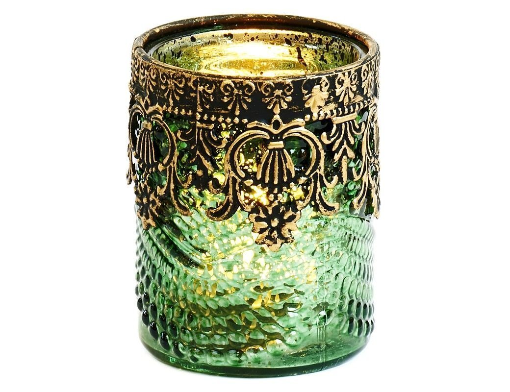Стеклянный подсвечник КРУЖЕВНАЯ ФИЛИГРАНЬ, под чайную свечу, зелёный, 8.5 см, Goodwill