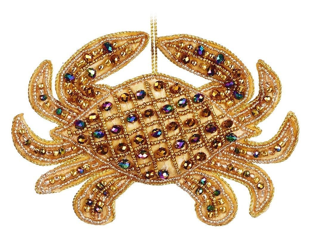 Это украшение словно драгоценная работа замечательной мастерицы: шитьё золотым бисером, жемчужинками и самоцветами, безграничная фантазия и великолепная передача формы настоящего и узнаваемого красавца-краба. Для неповторимого декора вы можете собрать всю морскую серию украшений из серии БИСЕРНОЕ ШИТЬЁ.