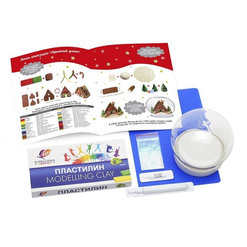 В наборе: подробная инструкция, сферическая основа для шара, цветной пластилин, доска для лепки, подставка для композиции, специальные жидкости, блестки для создания снежного эффекта.