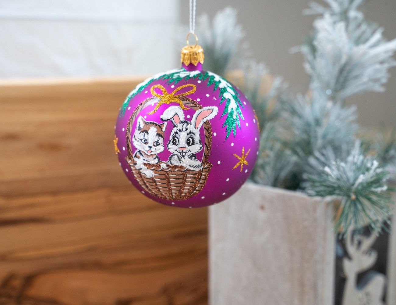 Стеклянный ёлочный шар ЗОДИАК: КОШЕЧКА И ЗАЙЧИК В КОРЗИНЕ, вишневый, 85 мм, Елочка