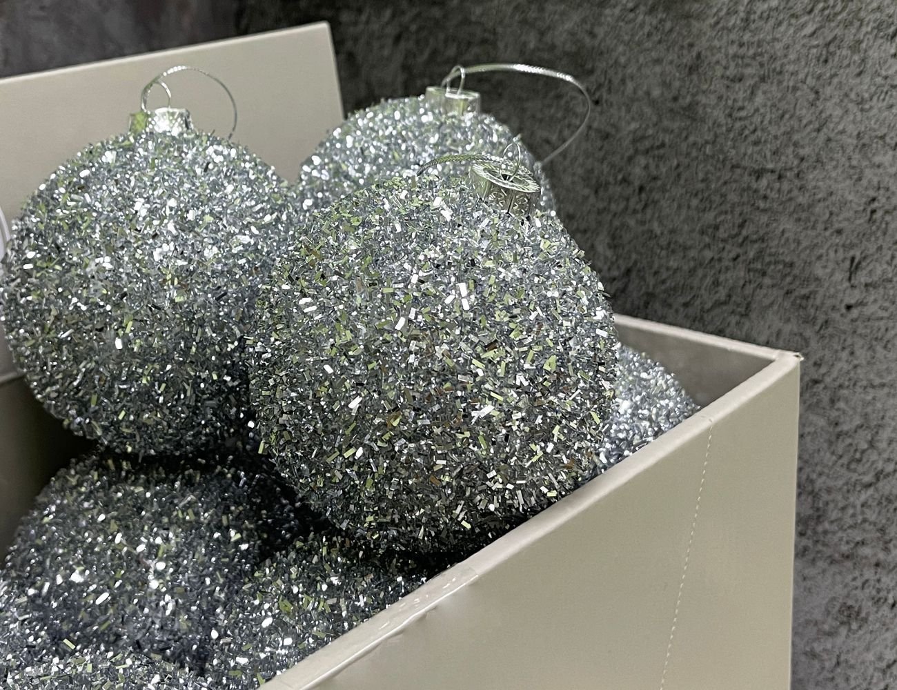 Однотонные, мягко мерцающие праздничными искорками серебристые шары с уютно-снежной фактурой – прекрасная основа для создания эффектного ёлочного наряда! Они отлично сочетаются с любыми игрушками и гирляндами, а главное – они не бьются, так что смело можно украшать ими ёлку даже в детском саду! А уж, если нужно оформить высокую ель или целый зал для праздничного мероприятия они просто незаменимы!