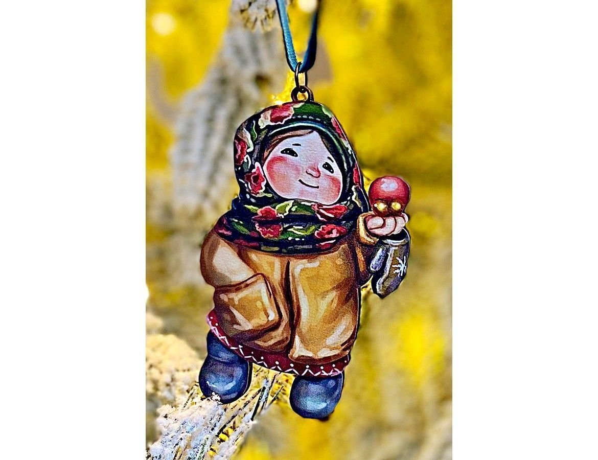 Елочная игрушка Девочка с яблоком - Зимние Каникулы 10 см, дерево, подвеска, МанузинЪ