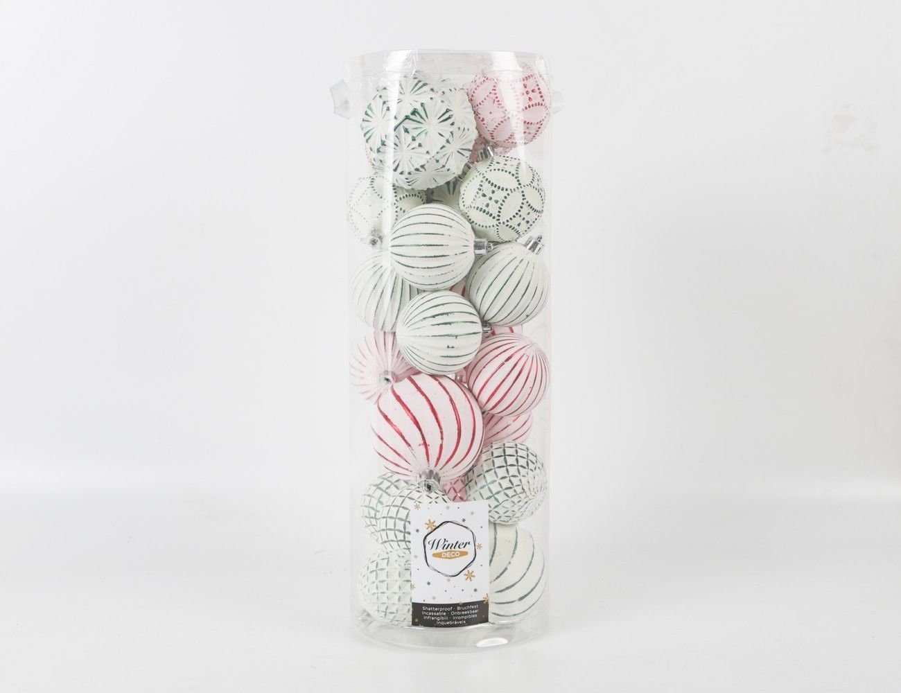 Набор пластиковых шаров ВАЛЬЦЕР ЛЕНТО, пластик, белый с зелёным и красным, 6-8 см, упаковка 24 шт., Winter Deco