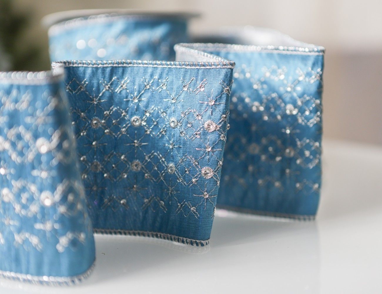 Декоративная лента "Cielo Freddo" с армированным краем, позволяющим зафиксировать любую созданную форму - великолепный предмет для творчества: с её помощью можно изысканно оформить подарок или букет, а можно своими руками изготовить разнообразные банты и розы для украшения ёлочки или декорирования интерьера. А подспорьем в этом послужит благородный небесный оттенок, ритм серебристого орнамента и мерцание пайеток. Фантазируйте и творите!