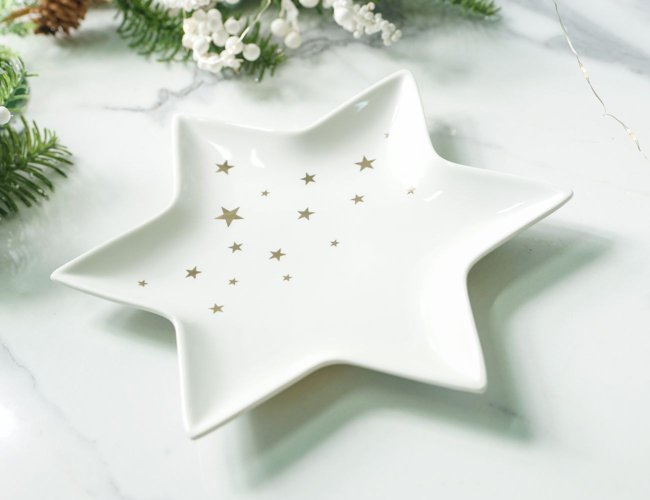 Как часто в каждый праздник мы используем одни и те же предметы для сервировки стола! Конечно, невозможно иметь отдельный сервиз для каждого праздника, но зато вполне можно обзавестись тематическим новогодним блюдом: белая фарфоровая звёздочка словно выкатилась из золотистого звездопада - она моментально создаст нужную праздничную атмосферу в самом центре стола!