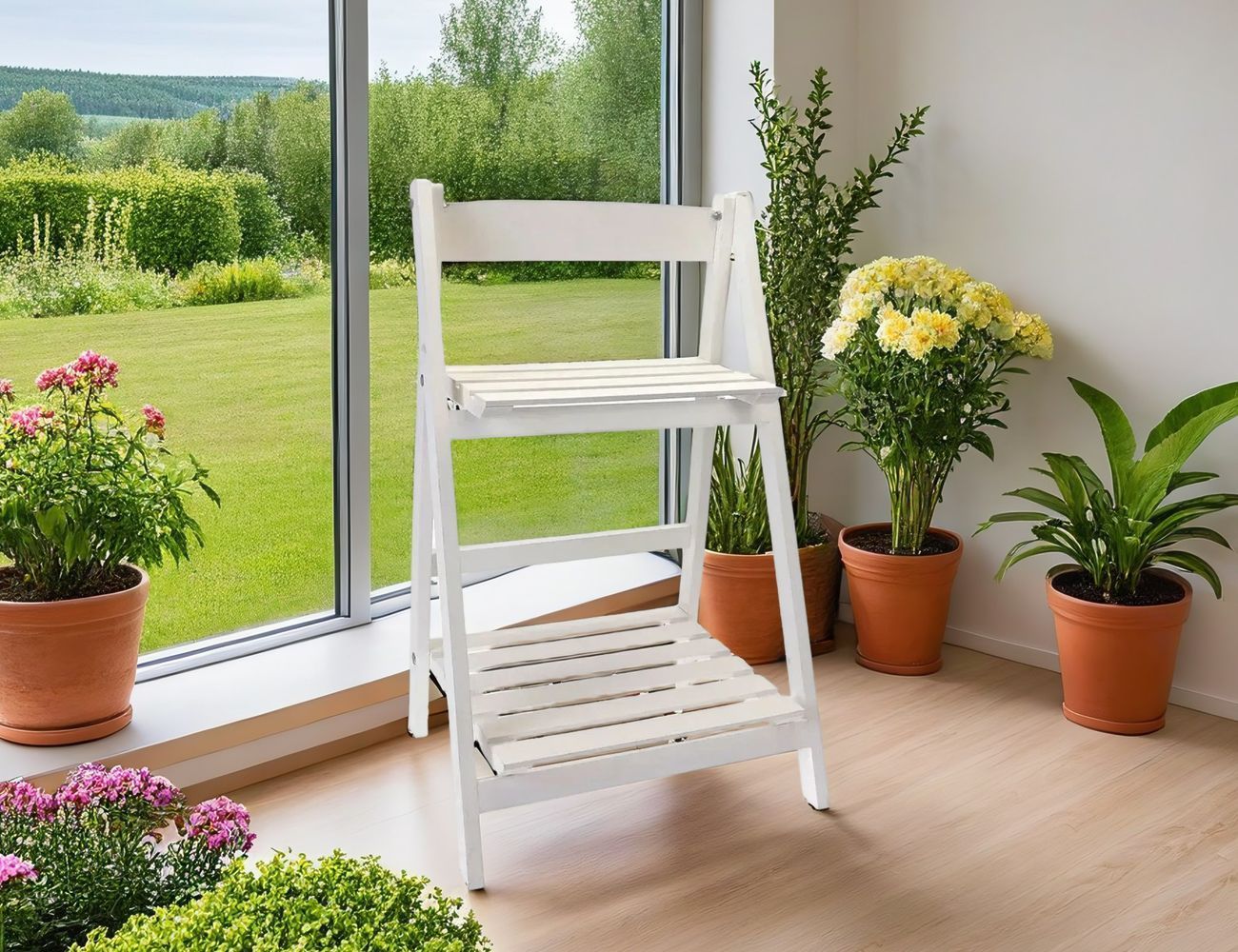 На балконе, в гостиной или в спальне - где бы вы ни решили разместить некоторые из любимых растений, раскладная белая этажерка придётся как нельзя кстати. Натуральное дерево - лёгкий и прочный материал, белый - идеальный нейтральный оттенок для любого интерьера, а складная конструкция с двумя полочками позволит и создавать разнообразные композиции, и с удобством хранить подставку тогда, когда в ней нет необходимости.
