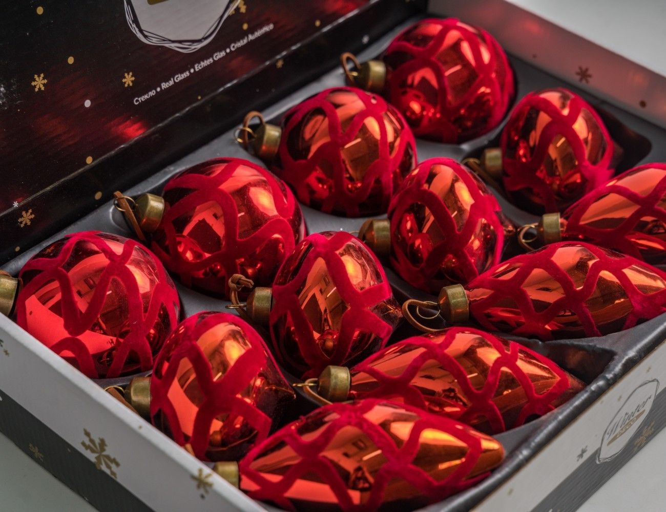 Перед нами настоящее торжество цвета и глянца, праздника и невероятной бархатистой элегантности! И всё это торжество наполнит ваш дом праздничной феерией в ту самую секунду, как окажется среди пушистых зелёных веточек новогодней ёлочки. Огоньки гирлянд и свечей, отразившись в алой зеркальной поверхности, закружатся в фантастическом хороводе с бархатными лентами, заполняя пространство атмосферой настоящего праздника!