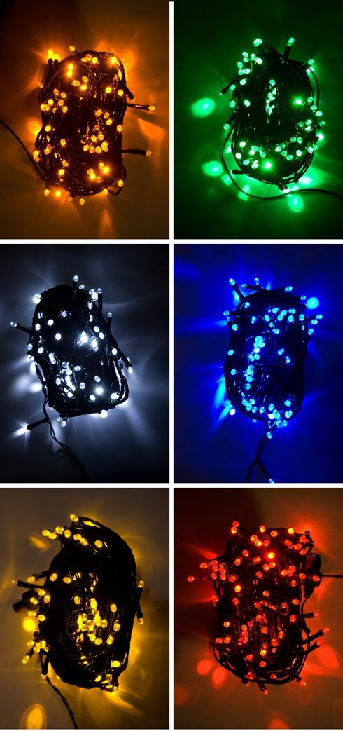 В комплекте гирлянды белого, синего, зеленого, красного, оранжевого/желтого и фиолетового цветов.