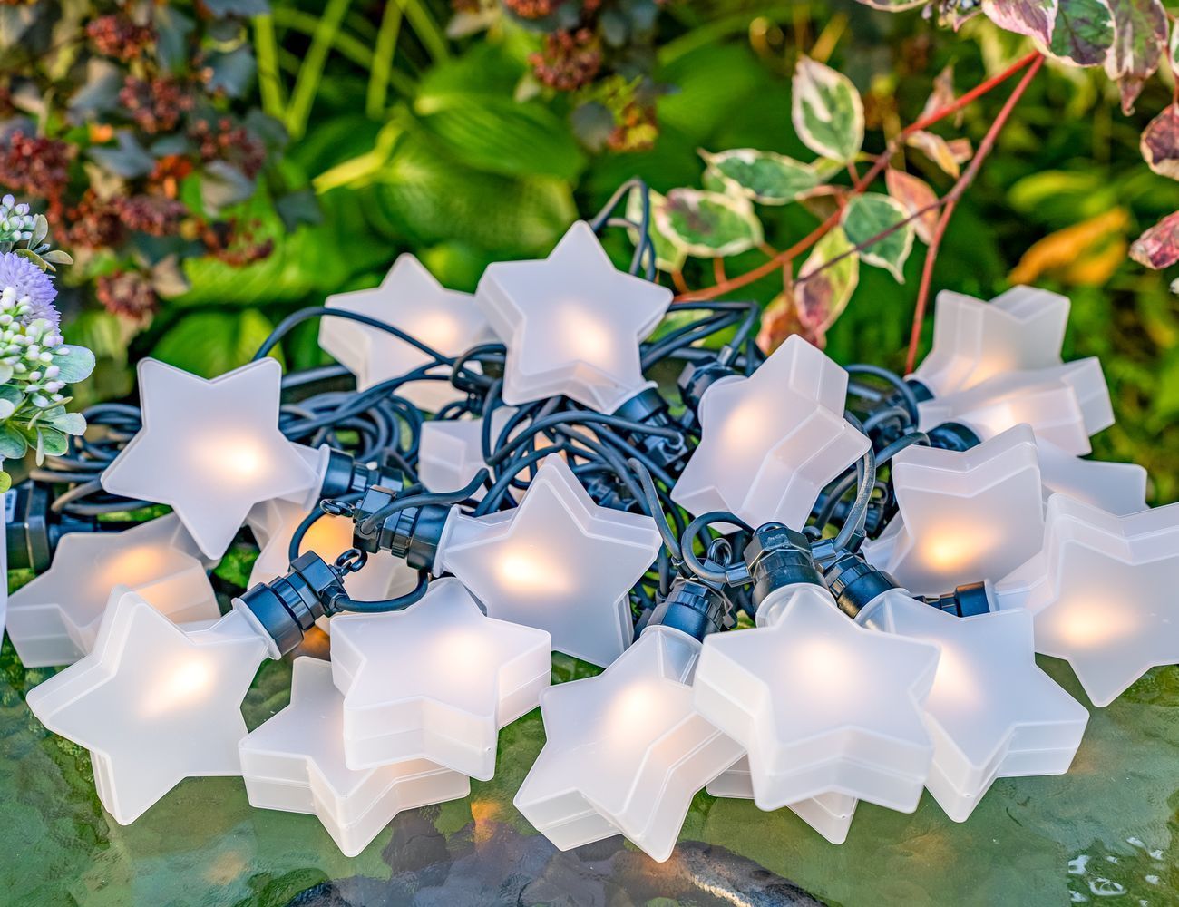 Светодиодная гирлянда Star Party Lights - ВЕСЁЛЫЕ ЗВЁЗДОЧКИ, 20 тёплых белых LED-огней, 10 м, контроллер, коннектор, чёрный провод, уличная, Winter Deco