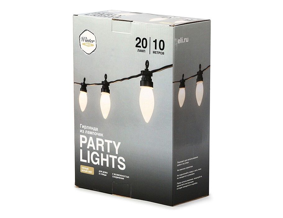 Светодиодная гирлянда из лампочек Party Lights - ШАРМ МИНЬОН, 20 тёплых белых LED-огней, 10 м, коннектор, чёрный провод, уличная, Winter Deco