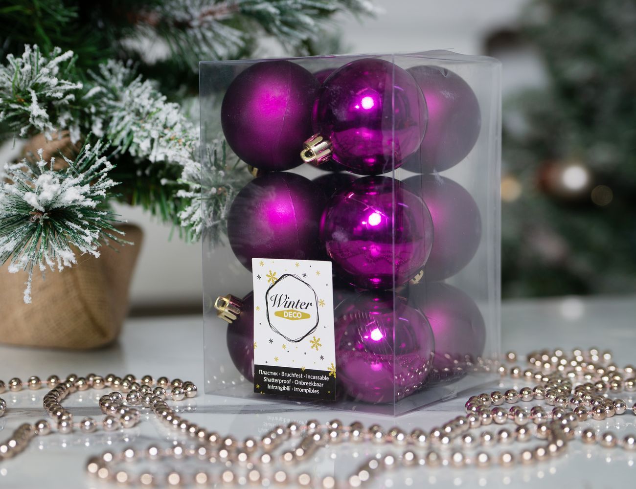 Набор однотонных пластиковых шаров глянцевых и матовых, цвет: фиолетовый, 60 мм, упаковка 12 шт., Winter Deco