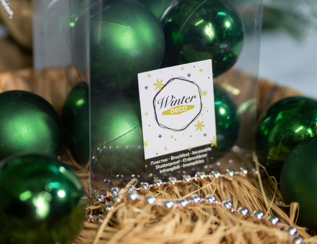 Набор из двенадцати пластиковых глянцевых и матовых шаров оттенка "сосновый зелёный" идеально подходит для создания базового фона ёлочного наряда!