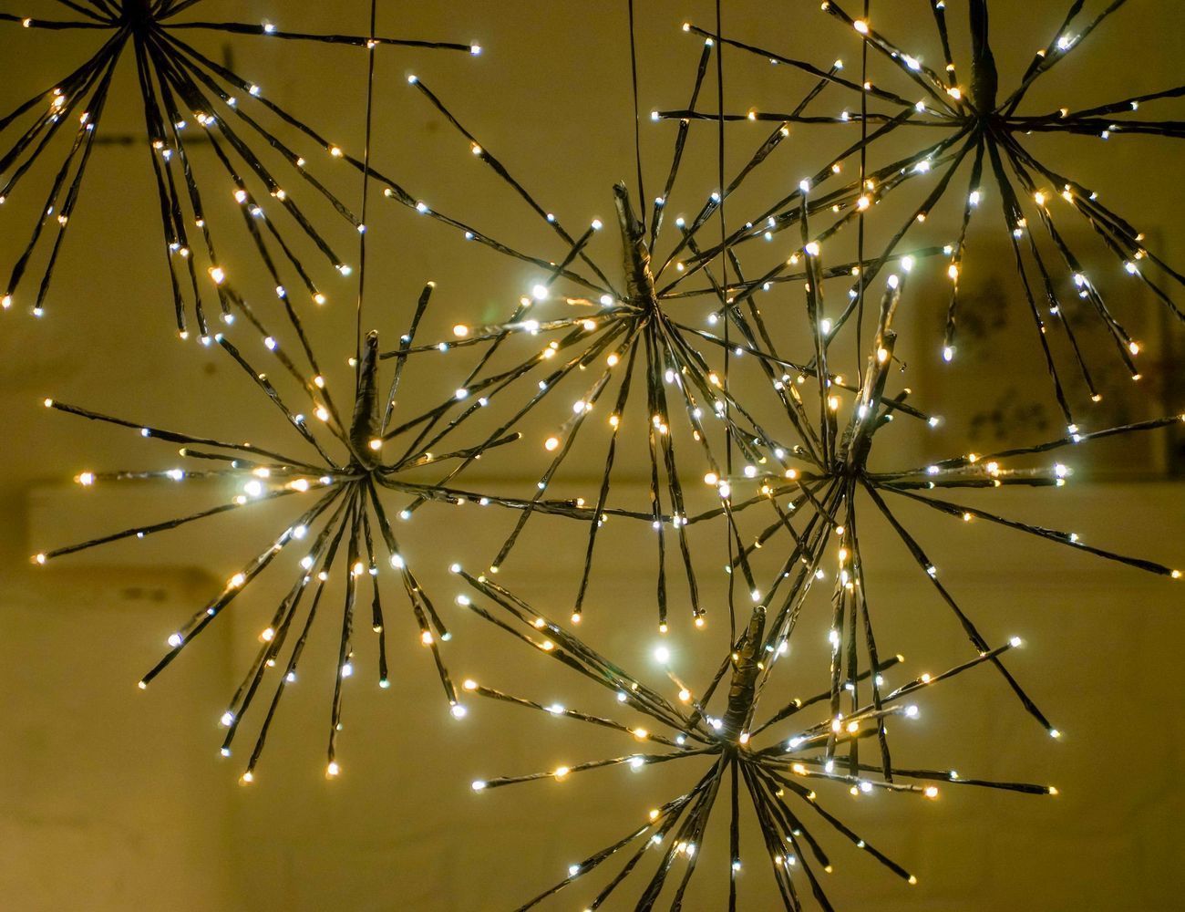 Очень необычная гирлянда-каскад - 6 'ёжиков', 6 сфер, которые получаются, стоит лишь расправить тонкие проволочки, усыпанные яркими тёплыми огоньками, часть из которых так кокетливо и весело перемигивается друг с другом! Конечно же, особенно эффектно такая гирлянда будет смотреться в саду, если развесить её на ветвях дерева, но и в домашнем интерьере можно очень интересно её расположить! Шесть проводов, на которых расположены 'ёжики' соединены между собой в основании - технической коробке, из которой в другую сторону выходит подводящий провод.