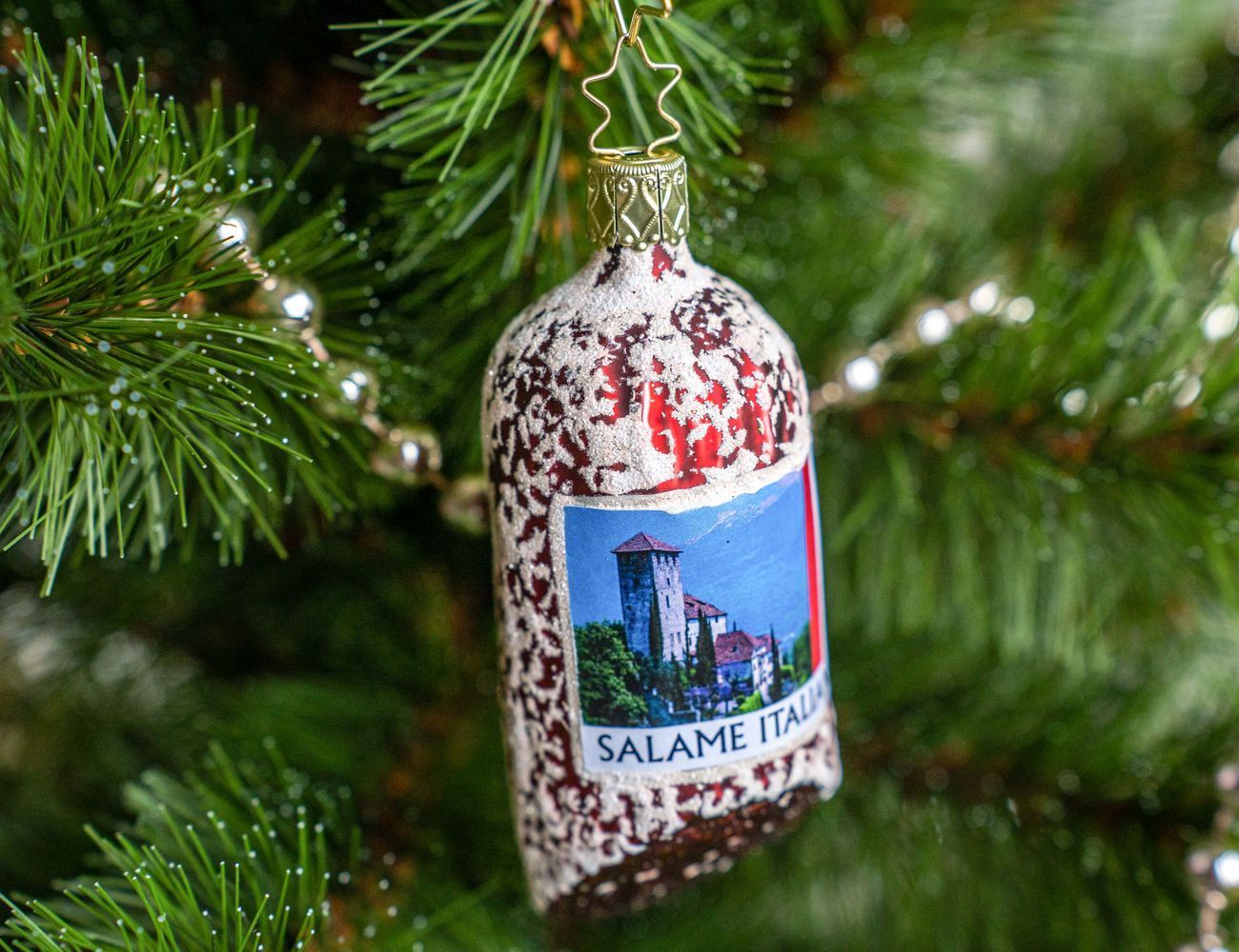 Ни один гурман и ценитель санкционных продуктов не устоит перед искушением повесить этот прекрасный кусочек настоящей итальянской Салями на самое видное место, чтобы он не оставался в тени других, даже самых изысканных ёлочных украшений! Да и зачем сопротивляться этому желанию? Он ведь такой аппетитный и заманчивый - вполне заслужил! А можно и целой коллекцией колбас и сыров ёлочку нарядить - очень даже оригинальное решение!