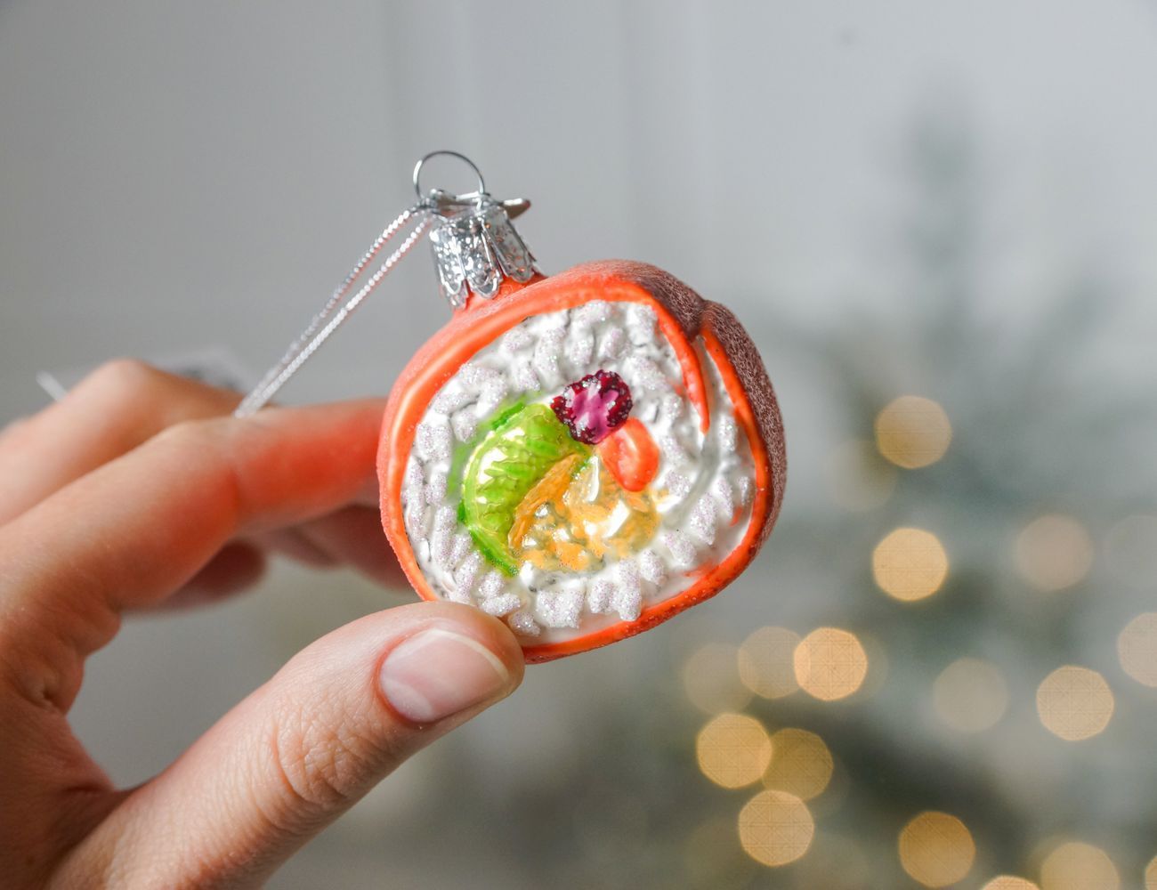 Роллы Японский Мотив — небольшие яркие акценты на ёлке. Игрушки, имитирующие еду — современный рождественский тренд, продолжающий традиции украшений в виде овощей, фруктов и ягод. Блестящие маленькие роллы — незаменимый атрибут для любителей креативного декора.
