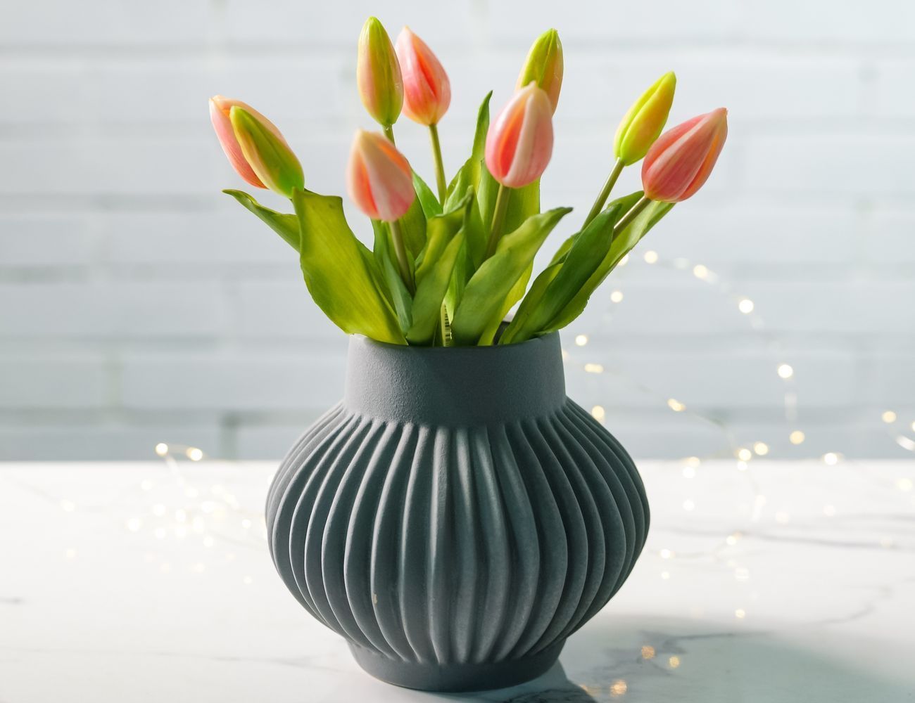 Необычная, будто песочная ваза, с легким веянием востока из-за своей формы, напоминающей китайский фонарик, но при этом спокойного серого цвета. В эту вазу можно смело поместить яркие цветы и зелень, ведь за счет нейтральности цветового решения букет не будет перегружен.
