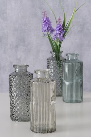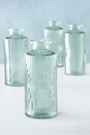 Вазы в форме бутылок из матового стекла цвета застывших льдинок разных оттенков в которых 'застыли' цветы, погружают нас в мистическую атмосферу зимнего леса вдоль которого реки уже скованы льдами.
