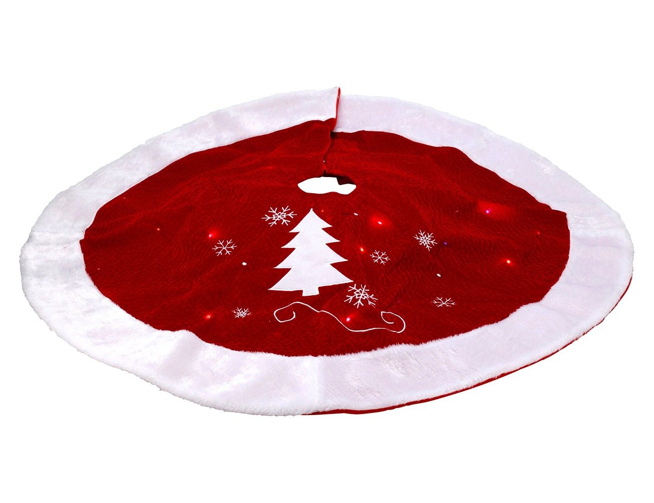 Ваша елочка станет настоящей модницей в этой юбочке из мягкой красной ткани, на которой изображена белоснежная елочка! А еще - это прекрасное решение, когда нужно красиво декорировать основание деревца. Она оригинально дополнит безупречный вид лесной красавицы и привнесет в интерьер особое настроение за счет подсветки из 24 тёплых огоньков!