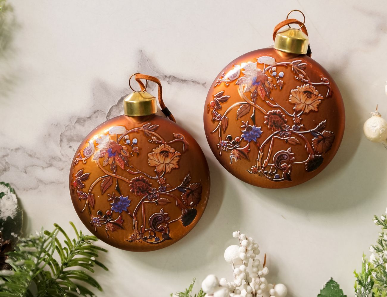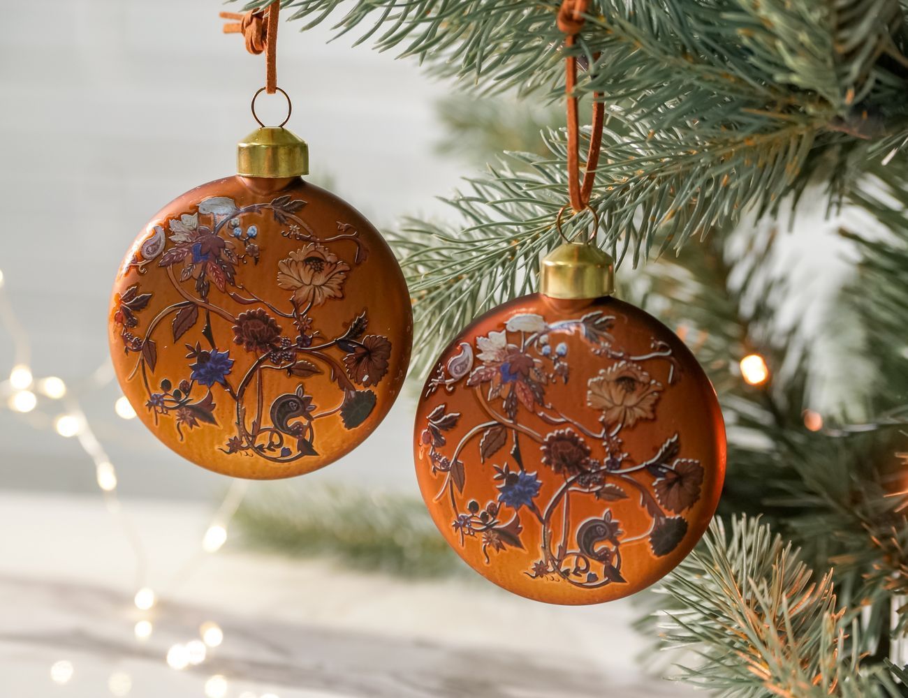 Фантастический цветочно-растительный орнамент, напоминающий лучшие образцы ар-нуво, элегантное сочетание оттенков шоколада, васильков и бронзы, классическая форма, изящный сатиновый финиш, ленточка в тон - в этих украшениях всё соединилось настолько гармонично, что вам непременно захочется определить для них лучшие, самые заметные места на новогодней елке! А если вы дополните этот набор украшениями 'Винье Бронз', получится очаровательная игра гармонии и контраста.