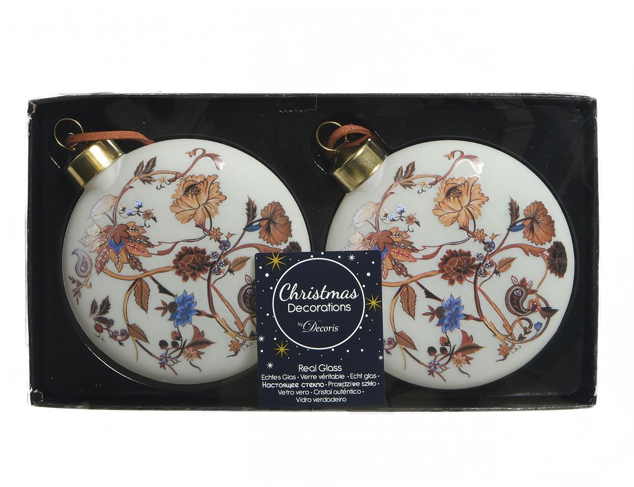 Фантастический цветочно-растительный орнамент, напоминающий лучшие образцы ар-нуво, элегантное сочетание оттенков шоколада, васильков и сливочного крема, классическая форма, изящный сатиновый финиш, ленточка в тон - в этих украшениях всё соединилось настолько гармонично, что вам непременно захочется определить для них лучшие, самые заметные места на новогодней елке! А если вы дополните этот набор украшениями 'Винье Крем', получится очаровательная игра гармонии и контраста.