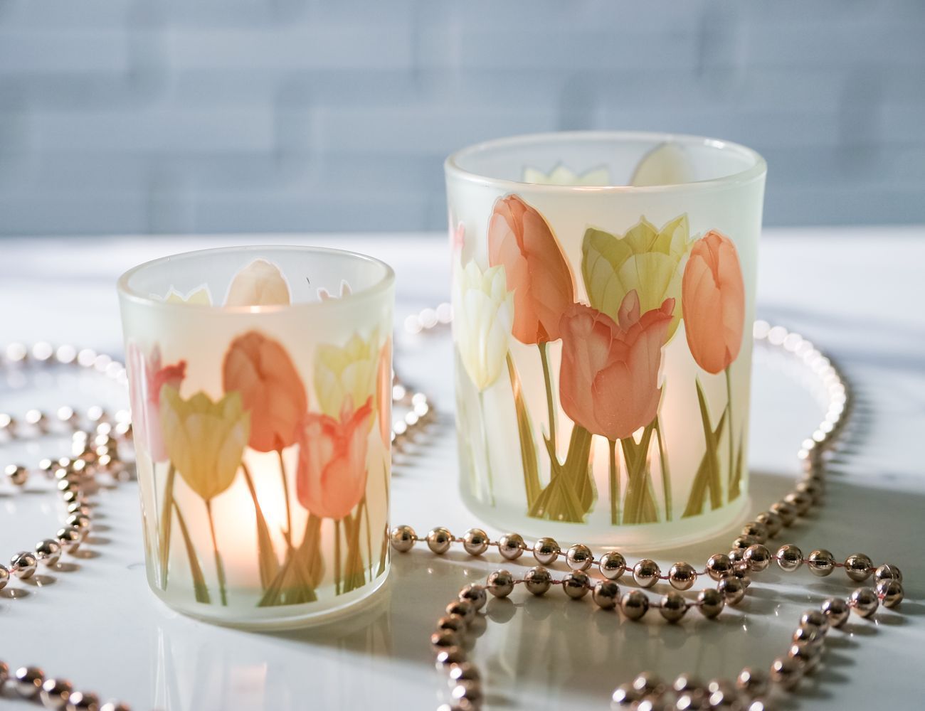 Милые зелёные подсвечники из матового стекла, на поверхности которых будто написаны акварелью невесомой кистью художника тонкой акварельной живописью изображены стройные тюльпаны с длинными стебельками и нежными лепестками. Огоньки свечей подсветят цветы изнутри, создав эффект витража. Эта нежная весенняя композиция наполнит дом светом, радостью и ожиданием чуда!