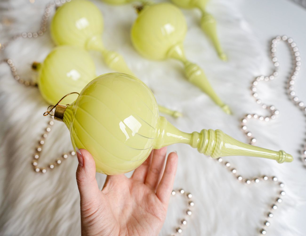Кому-то эти невероятно стильные салатовые украшения напомнят восточные фиалы для благовоний, а кому-то знаменитое богемское стекло, кто-то увидит в них сходство с ледяными сосульками, а кто-то даже с индейскими маракасами! Но, как бы то ни было, несомненно, что великолепный набор из полудюжины таких украшений подчеркнёт элегантность вашего декора и станет изысканным обрамлением для пушистой зелени еловых веточек!