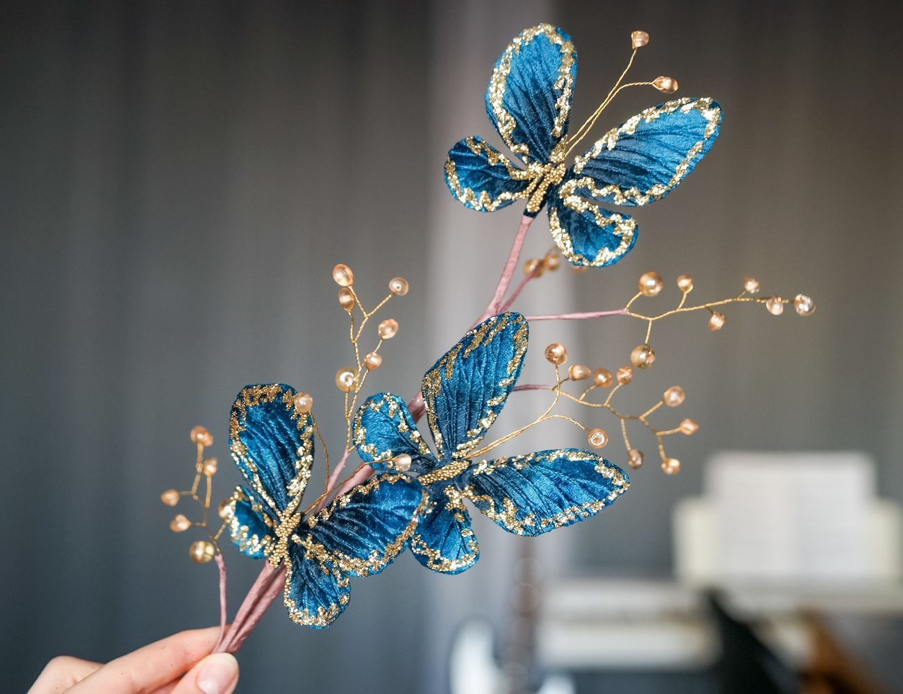 Декоративная ветка БАБОЧКИ БЛОУ, текстиль, пластик, синий с золотом, 56 см, Winter Deco