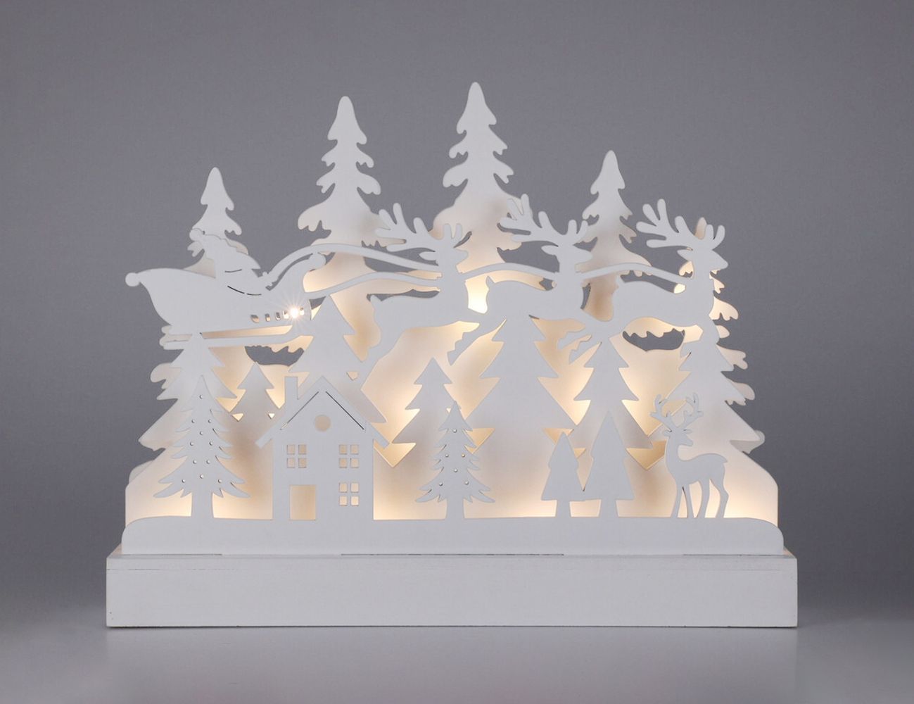 Если вспомнить, что Рождество и Новый Год - время волшебства, то легко представить, как в звоне праздничных колокольчиков, над заснеженными лесами и реками, деревеньками и городами по снежному небосклону несётся в санях, запряжённых оленями, сам Санта! Великолепная светящаяся композиция с белоснежным лесом, домиками и летящим Сантой принесёт доброе волшебство и в ваш дом!