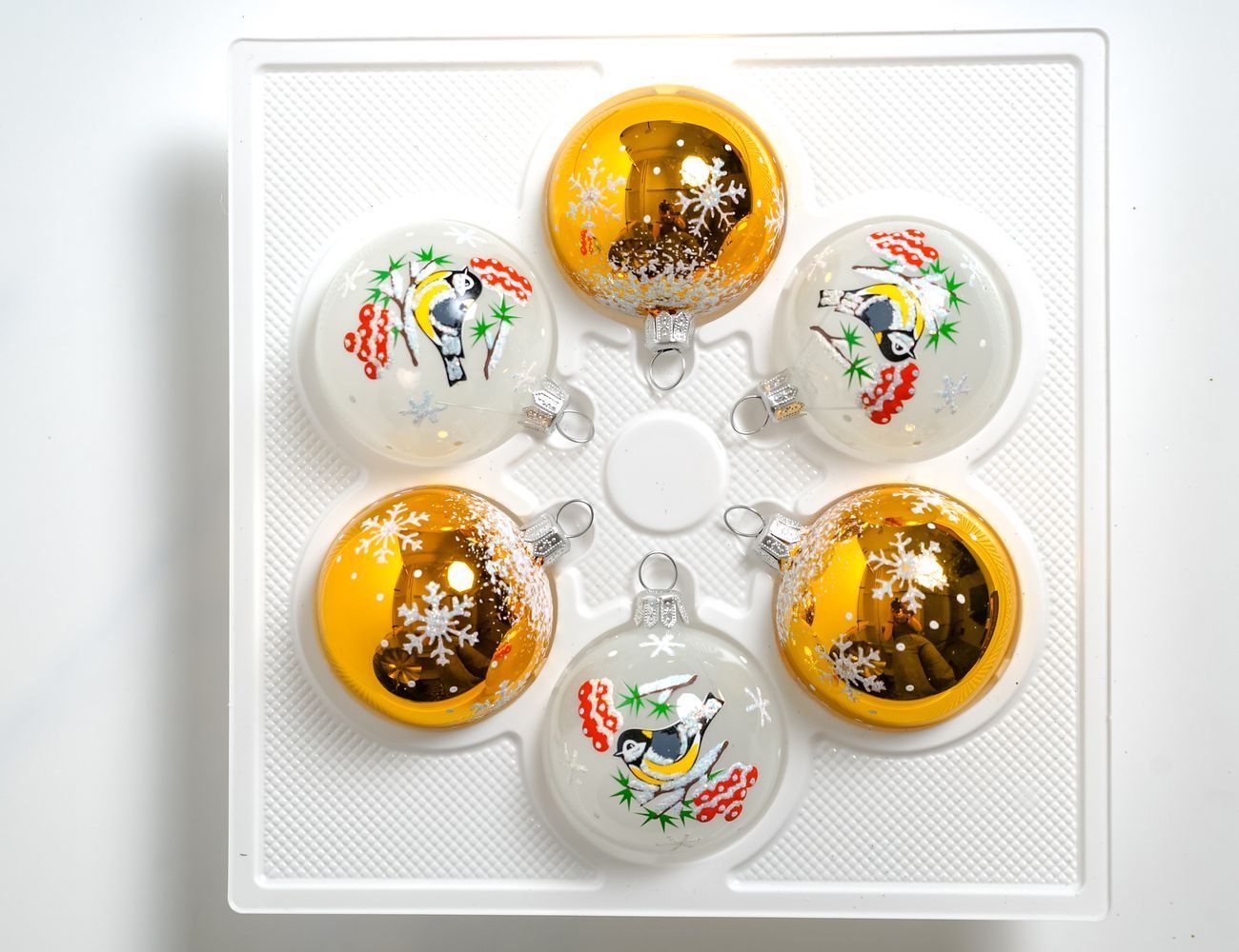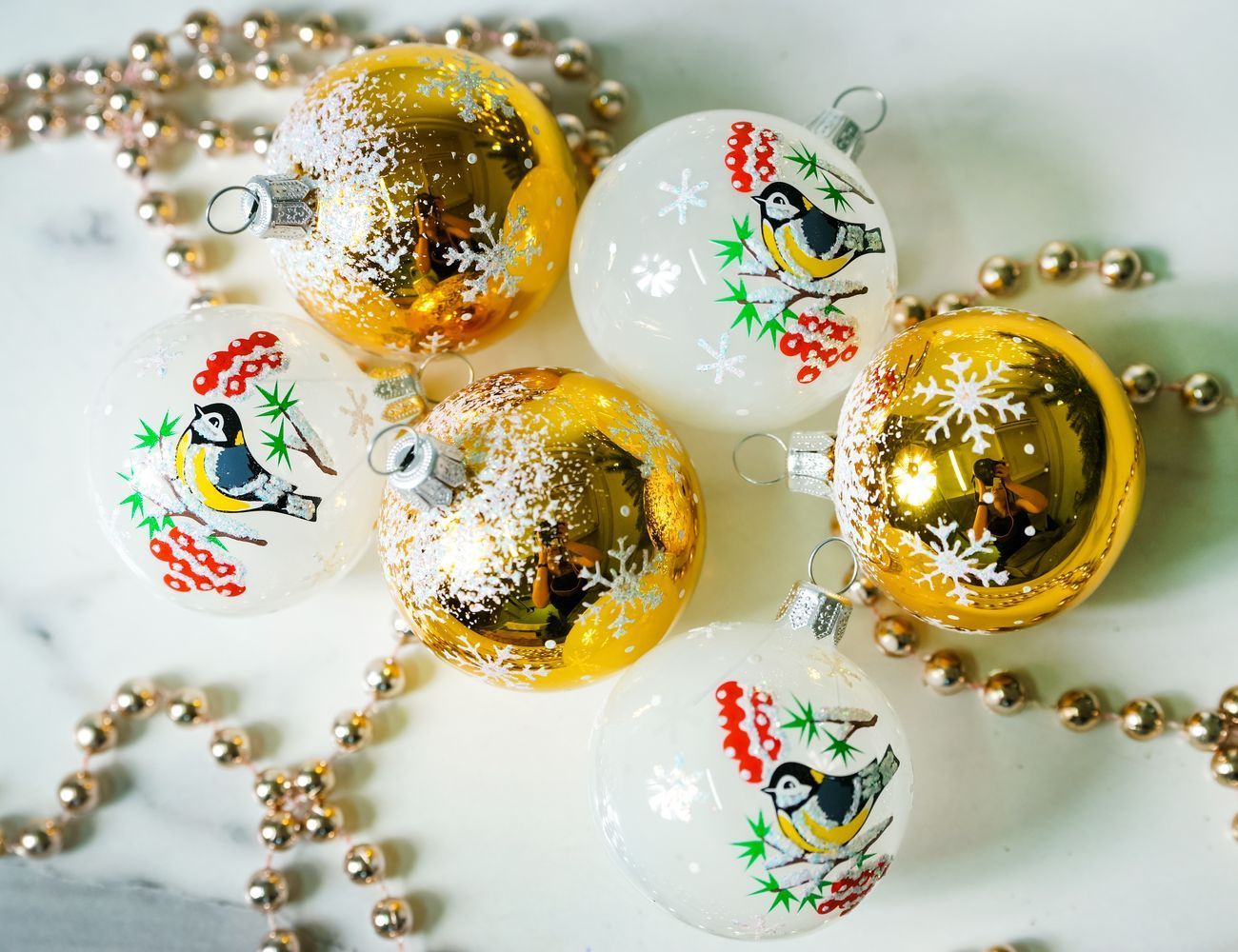 Набор ёлочных шаров СИНИЧКИ, бело-золотой, стекло, 50 мм, 6 шт., Елочка